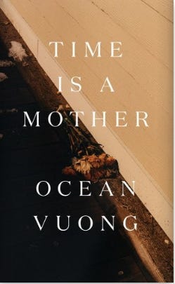 In her interview, Chung describes the many opportunities when Vuong could have quit but didn’t. He worked hourly jobs, studied literature, and wrote poems. The poems made their way into books, he made his way into an MFA program, his work earned him the prestigious Whiting Award and a MacArthur “Genius” grant. Along the way he wrote the collection Night Sky With Exit Wounds, the heart-breakingly beautiful novel On Earth We’re Briefly Gorgeous, and now his third book, the collection Time is a Mother.
