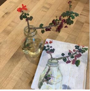 One of the reasons I follow Tanya Ward Goodman’s Instagram feed is to see the paintings she makes of whatever is on her kitchen “island.” She shares her paintings along with pictures of her walks around Pasadena and L.A. When I saw this geranium practically taking root on her page, I felt still and calm and alive. You may remember Tanya’s essay from September 2021 in these pages: “Being A Little Less There.”