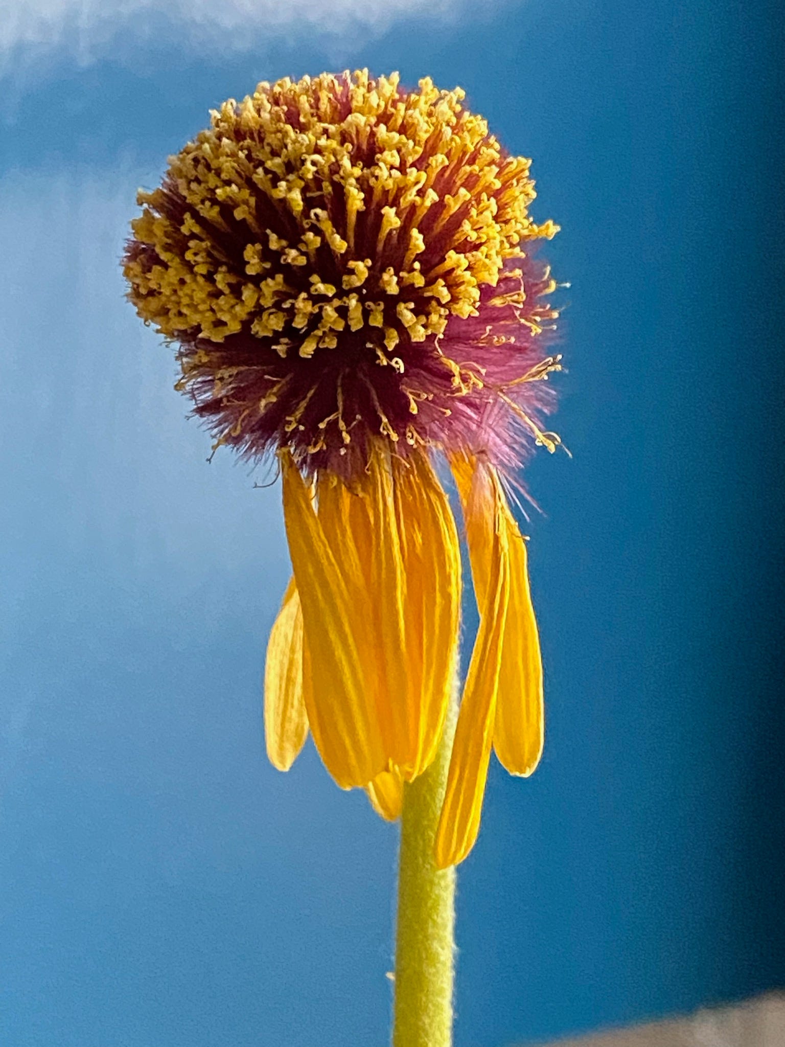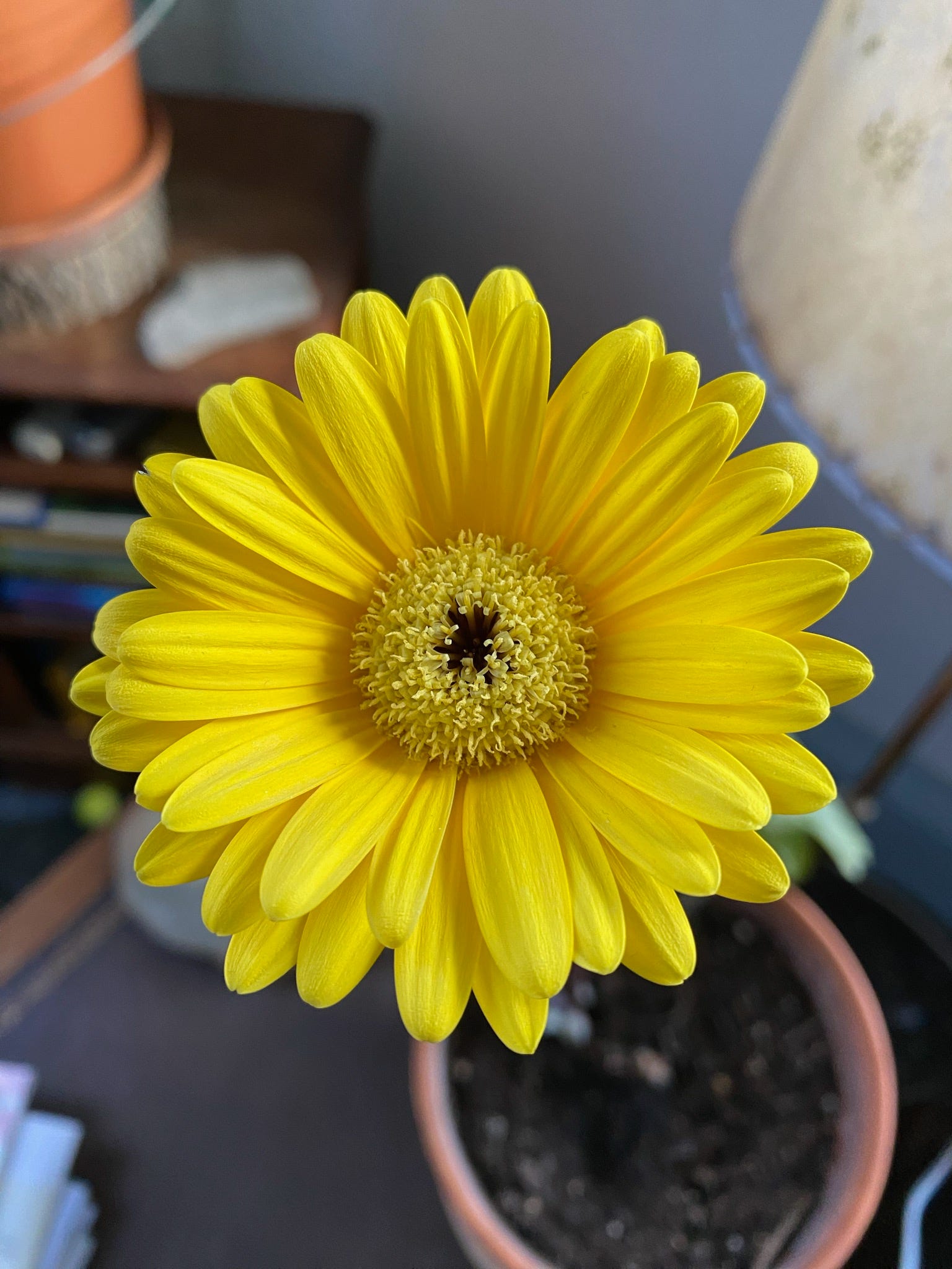 The brilliant life and gorgeous final days of a Gerber daisy that bloomed on Rae Francoeur’s desk in the frigid month of March when ice still covered the windows in her Massachusetts office where she writes and works. Both photos by Rae Francoeur.