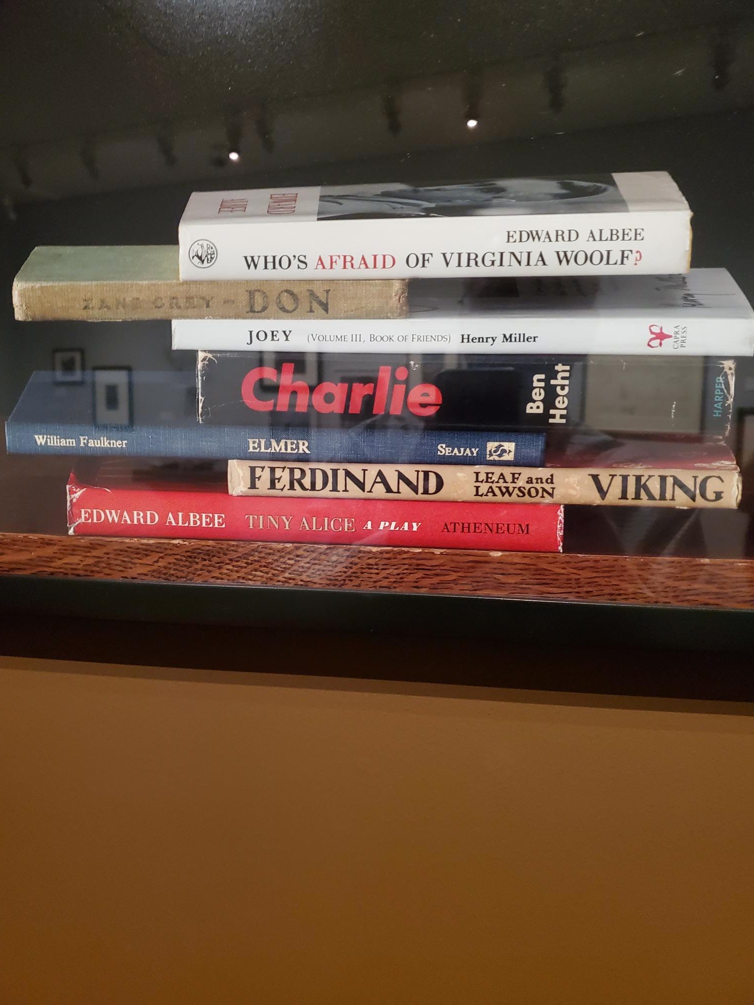 There’s the spine poem (poems created using the titles of books) and there is a whole spine conversation as Andrew Merton discovered when he and his wife checked out the J.P. Morgan Library and Museum in NYC and caught an exhibit by Nina Katchadourian, self-described artist of found things. Included in the collection was a series of book stacks, each arranged so that the titles, read from top to bottom or left to right, told a story. Inspired, he went back to his own book shelves to find the conversations hidden there.