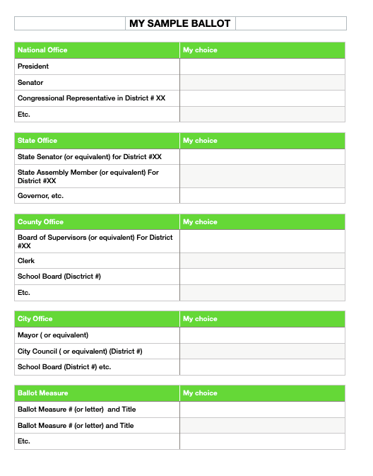 Fill out a “Sample Ballot” ahead of time. UPDATE: This link on the Ballotpedia site allows you to create your own sample ballot in seconds. Your state or county may also send you a sample ballot or voter guide automatically (here’s an article that explains how each state approaches this). Sometimes other organizations provide these. If not, use this link to ballotpedia’s sample ballot page to make one in seconds or , you can (and should) make your own using information available at most registrar or voter websites or news organizations. List each electoral race and ballot measure that you will find on your ballot when it arrives or when you go to the voting booth. It could look something like this: