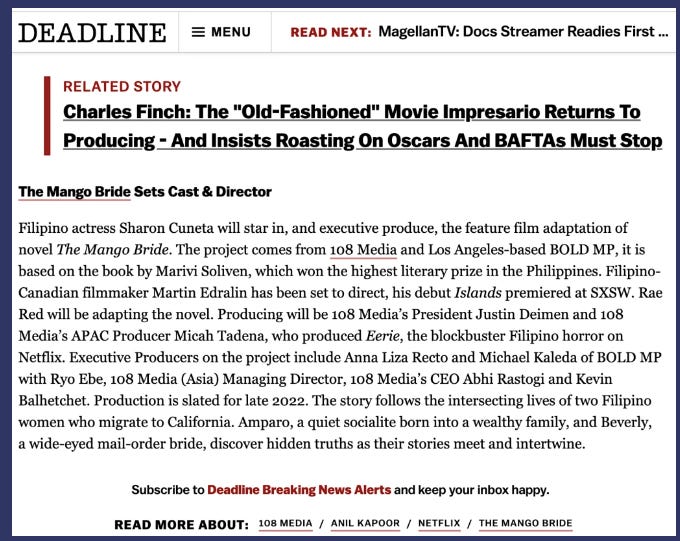 Marivi Soliven thought that, at least from a commercial perspective, her debut novel The Mango Bride was dead, done, kaput. Now a decade after its launch, it is being made into a full-length feature film. Meanwhile, a film based on her essay “Pandemic Bread” is making its world premiere next month at the Los Angeles Asian and Pacific Islander Film Festival.